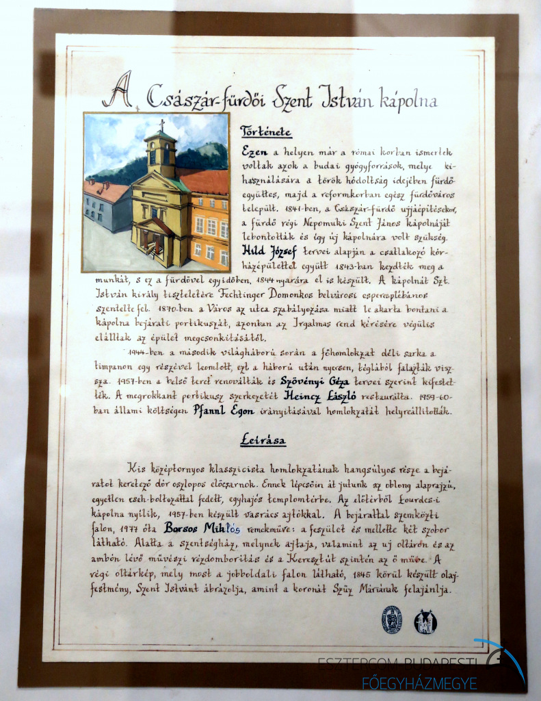 Ezen a helyen már a római korban is ismertek voltak azok a budai gyógyforrások, melyek kihasználására a török hódoltság idejében fürdőegyüttes, majd a reformkorban egész fürdőváros települt. 1841-ben, a Császár fürdő újjáépítésekor, a fürdő régi Nepomuki Szent János kápolnáját lebontották és így új kápolnára volt szükség. Építésére Kopácsi József esztergomi érsek 1843-ban adta meg az engedélyt. Hild József tervei alapján a csatlakozó kórházépülettel együtt még ebben az évben megkezdték a munkát, s ez a fürdővel egyidőben, 1844 nyarára el is készült. A kápolnát Szent István király tiszteletére Fechtinger Domonkos belvárosi esperes-plébános szentelte fel.